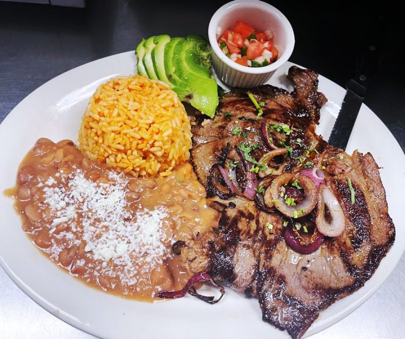 Sliced steak, served with rice, beans, avocado, pico de gallo and salad