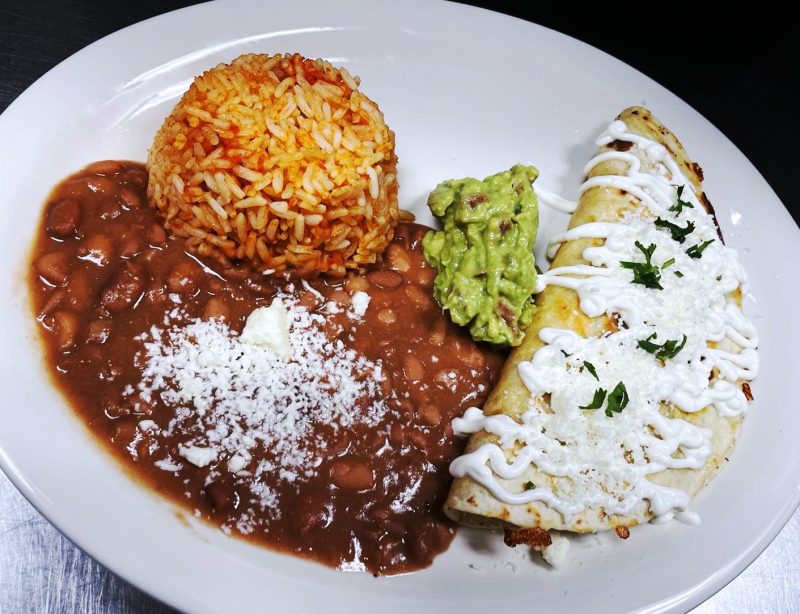 Large grilled flour tortilla filled w/ sauce, guacamole & sour cream / Rice & beans